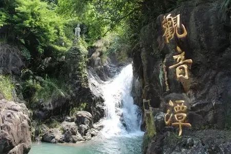 有一处胜叫观音赏水,最下边的瀑布,水纱之后有一尊白石,似观音端坐,静心观赏碧绿潭中的水。游人透过水纱,可以隐约看见这尊石观音。