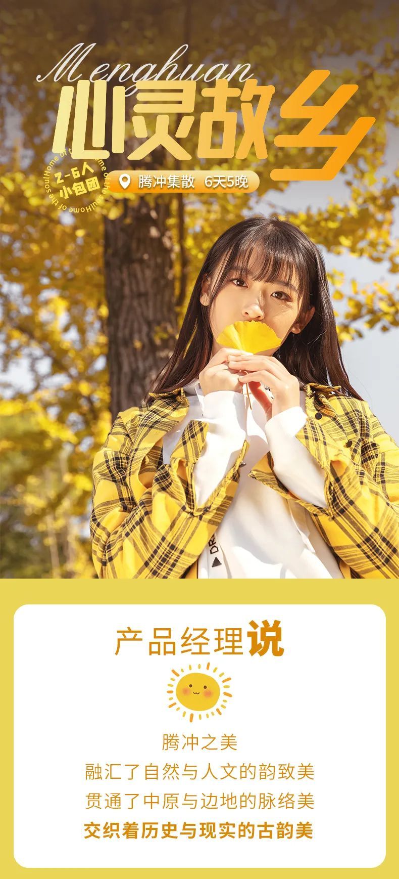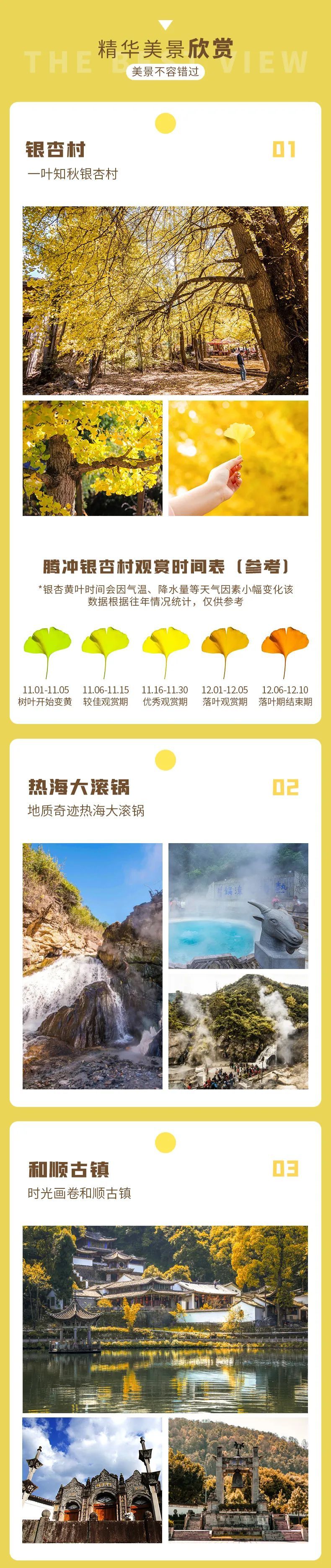 09:00云南腾冲【银杏村】内有两千多亩连片栽种的银杏树。九月底至十二月,小山村被高大的银杏树包裹得一片金黄,满地的银杏叶就如金色的地毯铺满村里的大小院落,风景绝美。此外,这里还有神奇的江东山古溶洞、秀丽的龙川江小江峡、神秘的古战场“鬼磨针”沧桑的石门古栈道、怪石嶙峋的莲花山等景点。