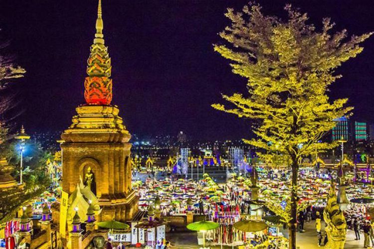 晚餐后,告庄西双景内夜市,自由品尝夜市小吃。后参观游览【告庄大金塔】告庄西双景为傣语,汉意为“九塔十二寨”, 旨在重现古时景洪盛景,打造一个繁华昌盛的“景洪城中之城。自由逛【告庄西双景】夜市,今晚的晚餐自理,星光夜市是西双版纳必到的网红打卡点,集美食、美景为一体。游览后,安排入住酒店。