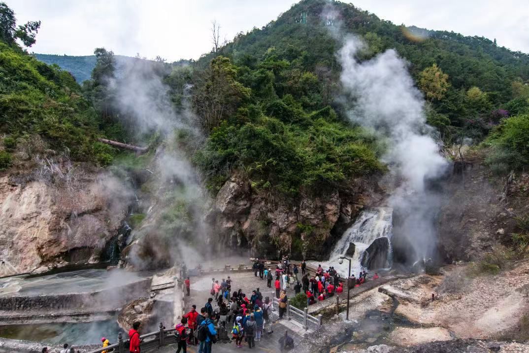 09:30 抵达【热海风景区】。这是腾冲火山地貌的集中体现,温泉从地表喷涌而出,其中壮观的便是大滚锅,温度高达100度左右,蒸汽冲天。走近热海,雾气缭绕, 大滚锅、爆炸泉、美女池等各有千秋,景观令人惊叹。温泉不仅可以观赏、泡澡,还可以蒸煮食物,有名的云南十八怪-鸡蛋用草拴着买就来源于此——在大滚锅台阶一侧留有许多气孔镶为小槽,小商贩用它来蒸草拴好的鸡蛋、花生等食物。