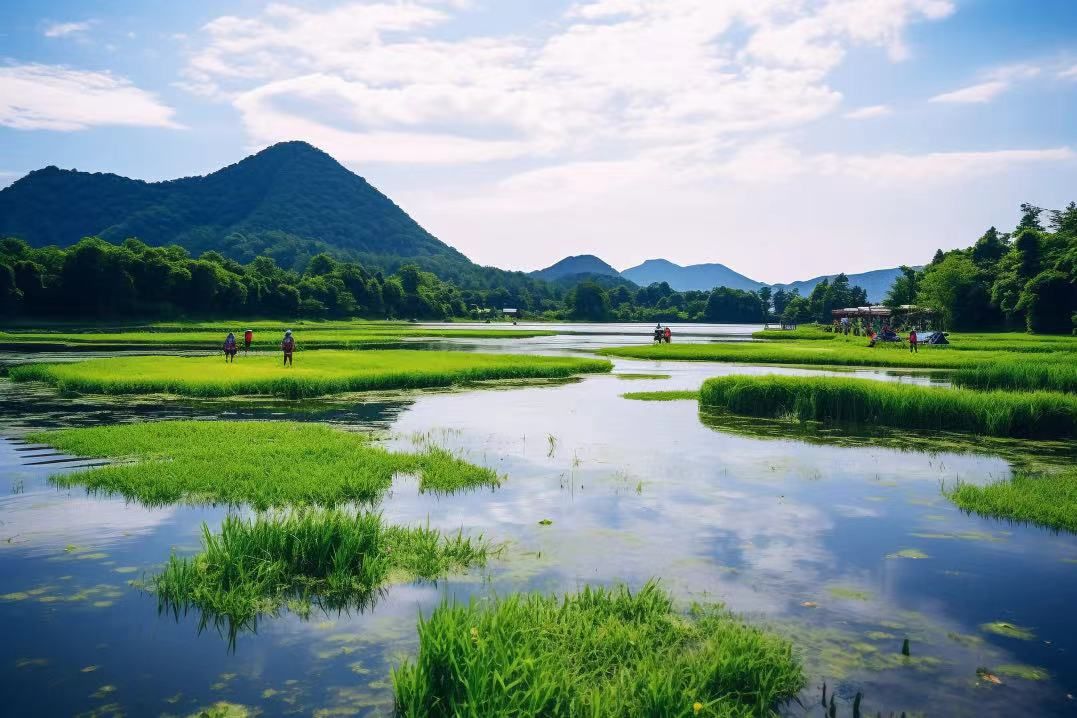 13:00 抵达世界上唯一的高原火山堰塞湖浮毯型苔草湿地-【北海湿地】,千万年前,剧烈的火山爆发,不仅仅为腾冲留下了火山、温泉的地质奇观,还为腾冲留下了这片天然北海湿地。在火山灰的滋养下,根系缠绕盘旋,形成了漂浮于水面的大面积浮毯草排,最厚可达2米。【划草排体验】是最具特色的旅游项,我们在这里割一块草排,尽情玩耍。