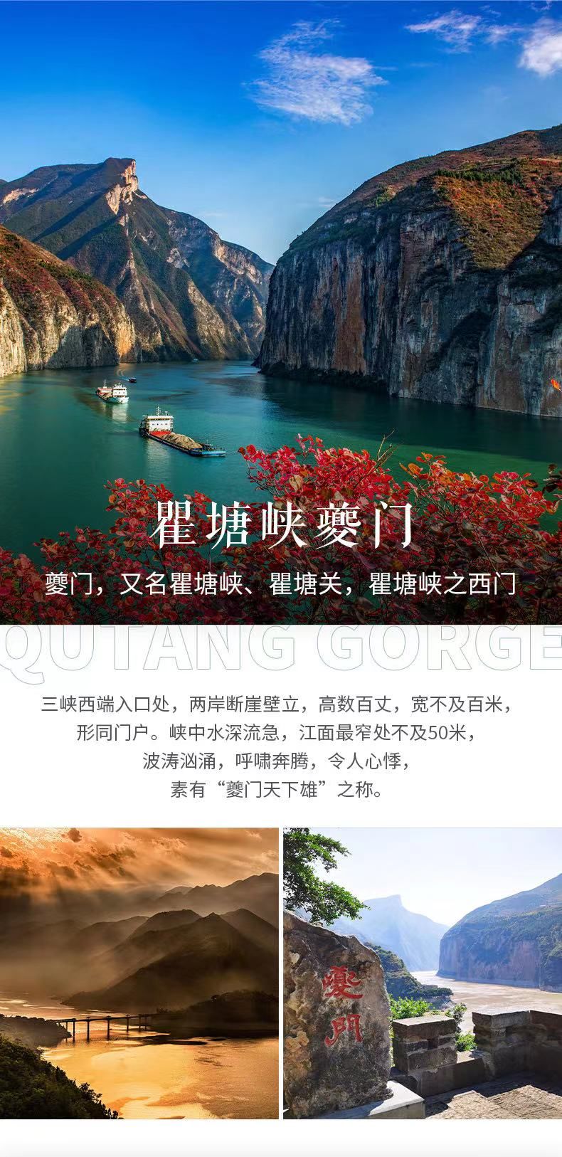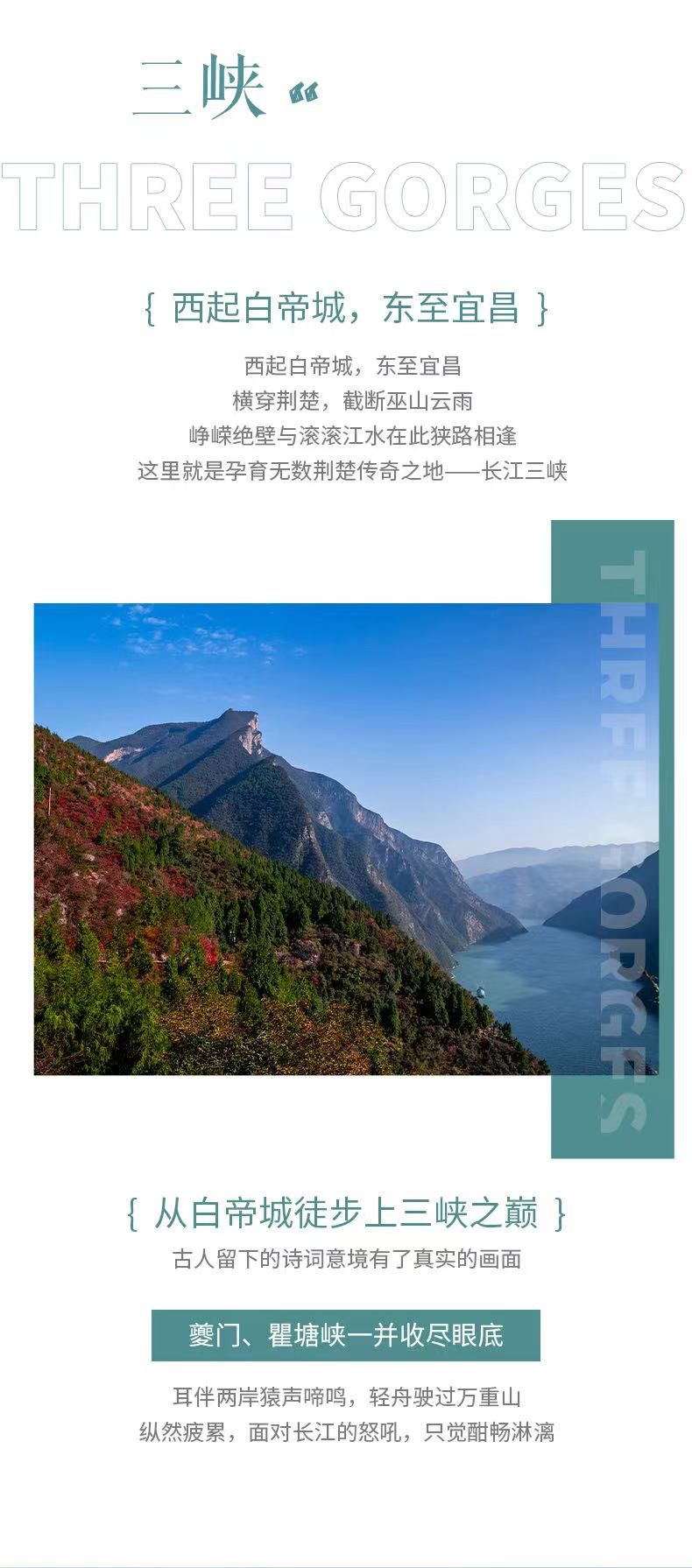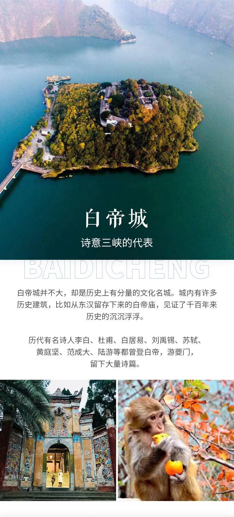 下午,我们将来到【白帝城】,白帝城在瞿塘峡口的白帝山顶,是历代兵家必争之地。还记得三国时期刘备白帝城托孤吗?我们将深入山间小路,拍摄瞿塘峡风光,如果你还能找到一张第五版10元人民币,别忘记带上,看看【夔门】过去和现在的变化,我们还有可能碰上猿猴,你会感受到古诗中猿鸣三声泪沾裳的意境。