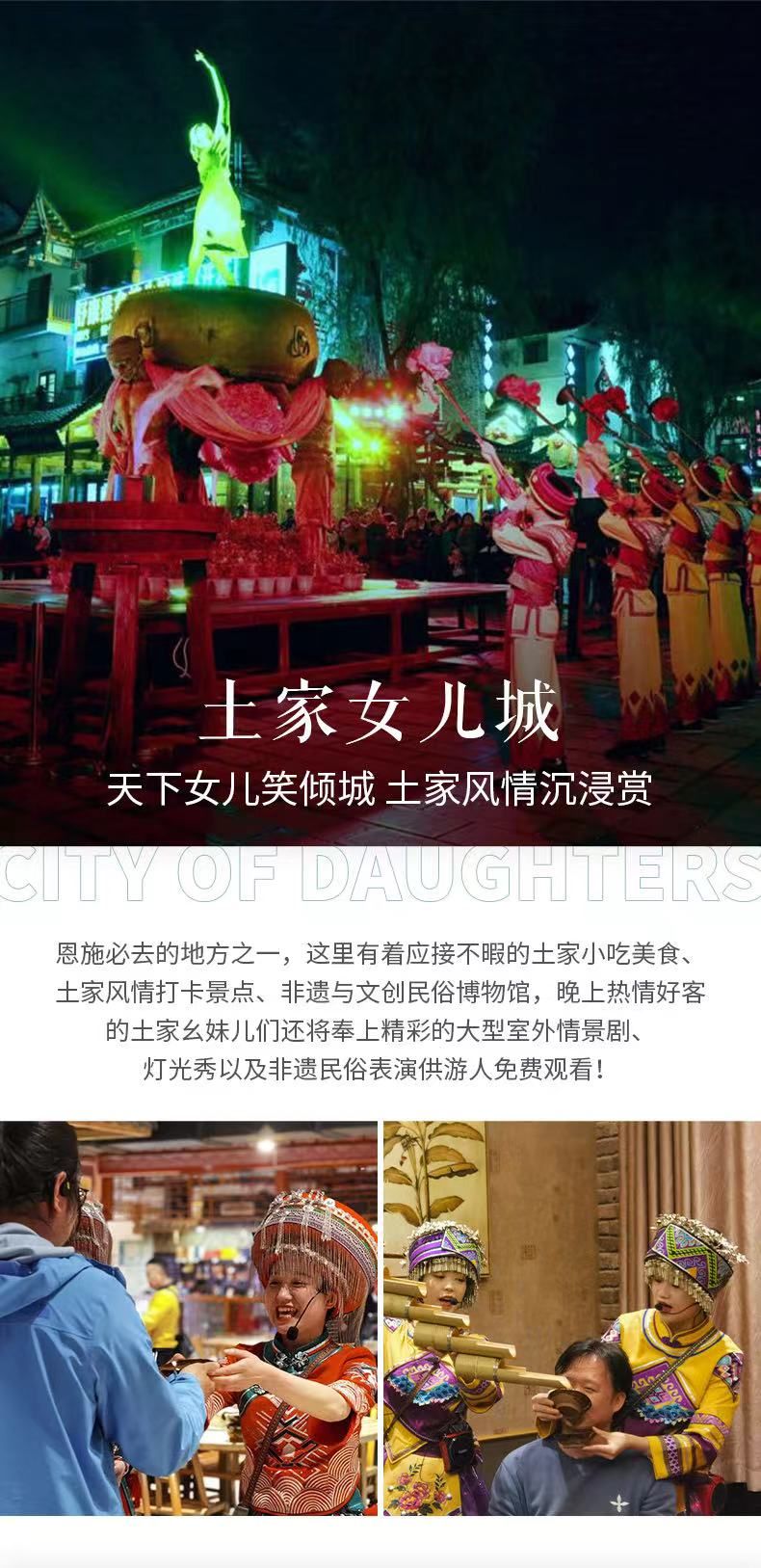 晚上,我们前往“世间男子不二心,天下第一女儿城”的土家女儿城,去民俗博 物馆看看土家人民的生活场景。晚上 7 点多,更有大型室外情景区《赶场相亲 会》表演可以观看。