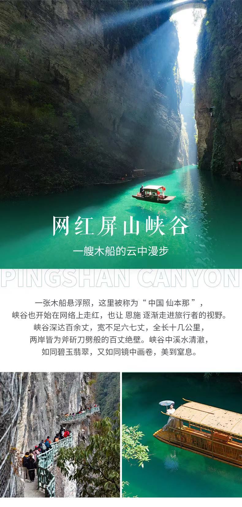 我们乘车前往【屏山峡谷】(车程约2.5 小时,游览约4 小时),屏山峡谷被誉 为“中国仙本那”,这里是恩施旅游必览之地。屏山四周峭壁悬空,碧水环绕,青 山翠绿,在峡谷中的水面游弋,抬头看去,四周峭壁耸立,溪流环绕。 我们徒步至峡谷底部,乘坐网红「漂浮小船」之旅,悠闲地荡漾在碧水青山之 中。漫山遍野的映山红,倒影在河面的一艘艘木栈,漂浮在山水一体的清江河面, 水下鱼儿慢悠悠的游过船底,遗世独立的样子。快,抖音视频、朋友圈走起来!