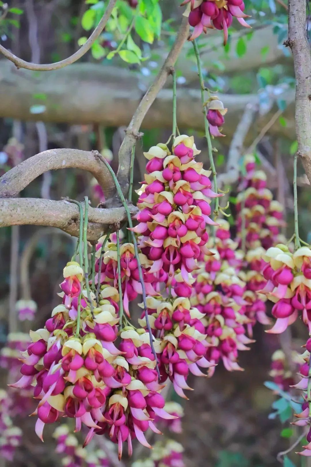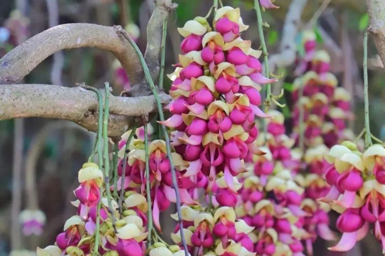 【清远禾雀花】位于广东省清远市清城区东城黄金布上下企岭,生态环境得天 独厚,常年四季如春,鸟语花香,是人们观光休闲的理想胜地。设有六大配套分区和一个接待 中心。六大配套分区:一是禾雀花幼苗培育分区;二是禾雀花观光分区;三是亲子家庭乐园分 区;四是中国名鸡养殖基地分区;五、禾雀花文化展览馆分区;六是鱼翅瓜观赏分区;基地内 总共种植禾雀花特色品种 7 个,分别有红色、紫色、粉红色、粉玉色、浅绿色、米黄色、白色。 禾雀花因为花朵形状奇特而出名,十分似禾雀,花开时节,吊挂成串,直接长在藤蔓上,就像 千万只禾雀栖息在林中浓荫下,形神兼备,景象十分壮观